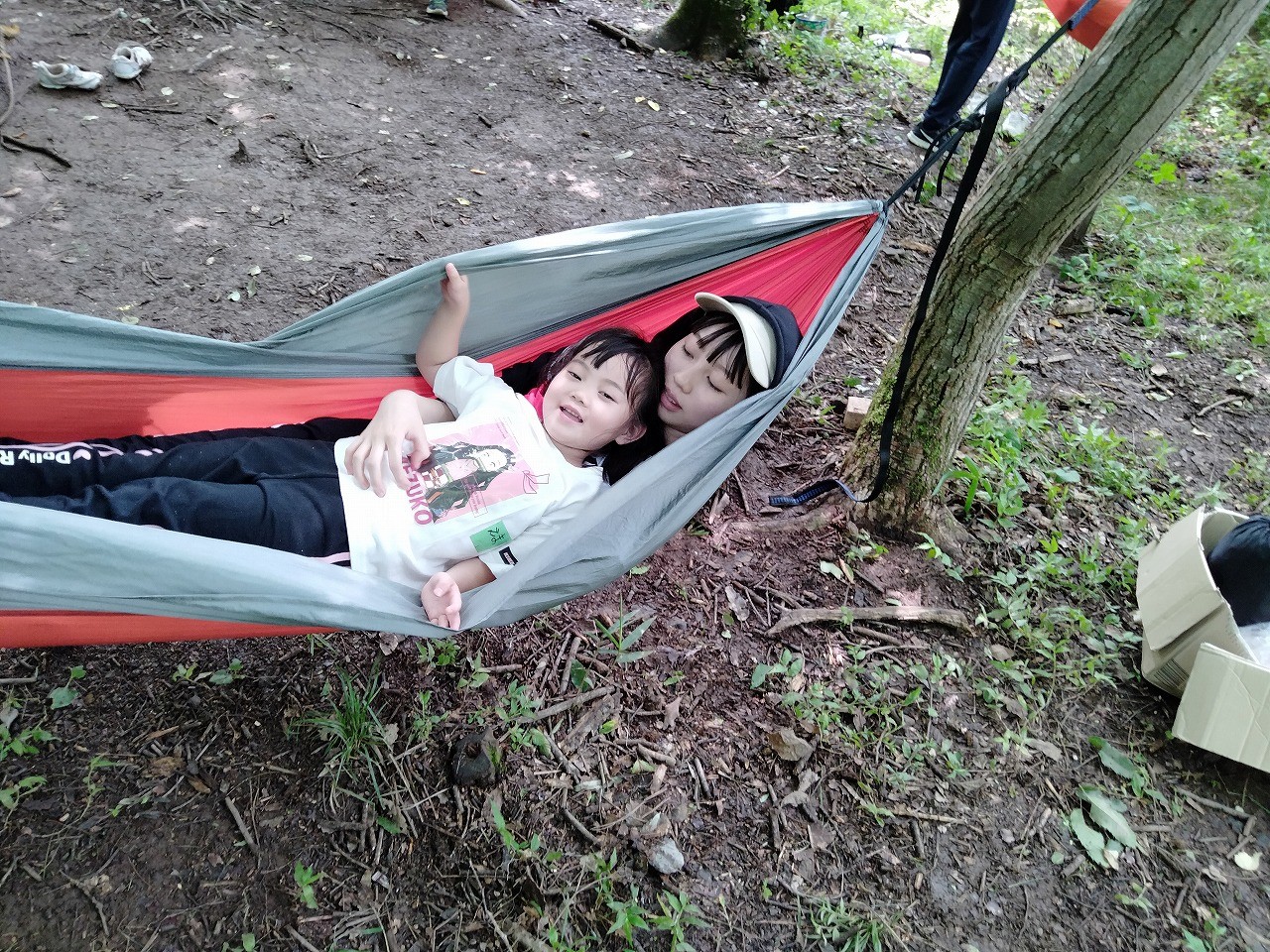 沢山の方が参加してくれ、皆で思い思いにハンモックを吊るして遊びました。また、ターザンロープやブランコに乗ったり、更には大人も子供も混ざってケイドロ(鬼ごっこ)までしました。