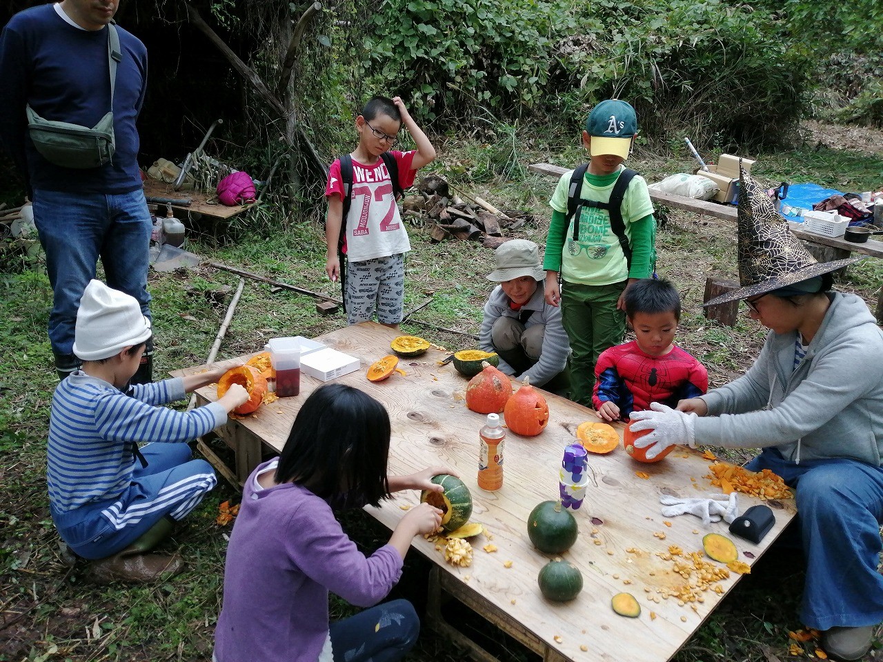- 持ち物;持ち寄りの食べ物(ご自身の参加人数分程度の食べ物、カボチャランタンづくりの材料(カボチャ、中をくりぬくスプーン、穴をあけるナイフ)、子供たちに配るためのお菓子