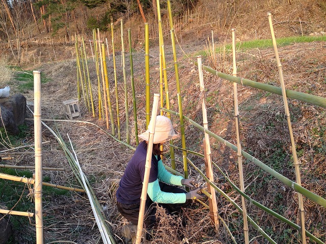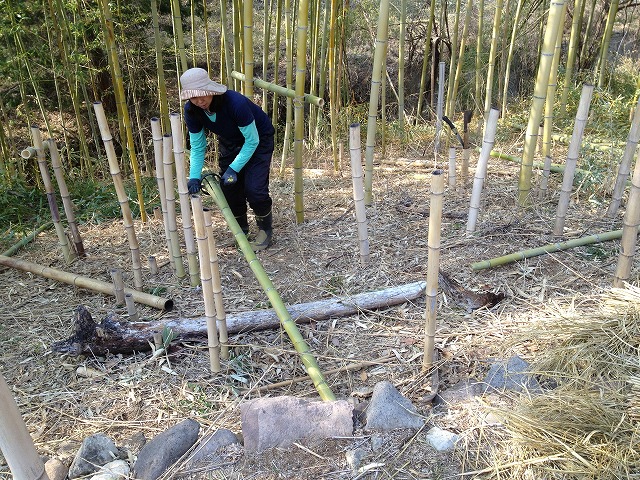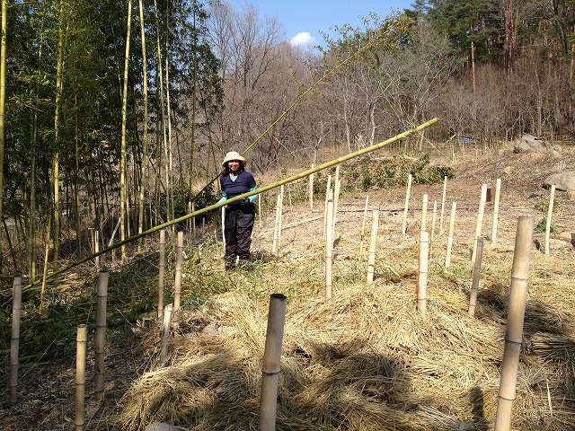 援農者(Mさん)が竹の柵作りを手伝いに来てくれた。