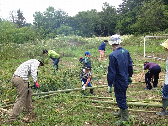 二日目は竹の伐り出しと結び方のおさらい、そして秘密基地の組み立てに入りました。