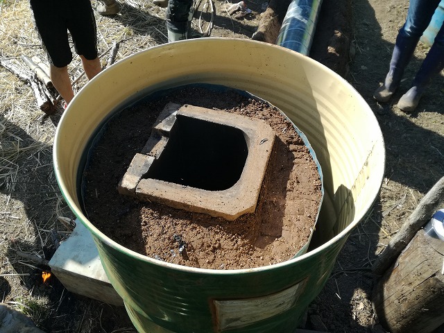 皆さんで掘り出した土や断熱材をストーブ内部に詰めていきます。