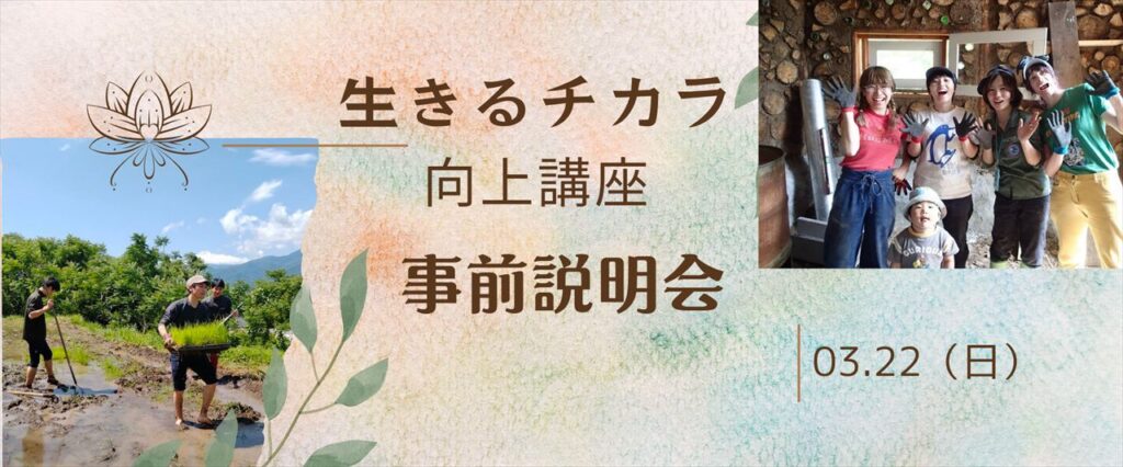 田畑、山林などの自然の恵みを活用して食料やエネルギーなどを調達することと、空き家を活用したり自ら家を建てたりすることを組み合わせることでお金をかけずに食・住を満たせることを実践を通して学びます。食や住が確保できると心にゆとりが生まれ、自分が本当に望むことについて考えたり実践する時間がとれるようになります。自分本来の生き方ができるようになってもらうための実習講座です。この講座では細かい技術ではなく、どんな事が起こっても自分の力で解決していくためのノウハウを学べます。